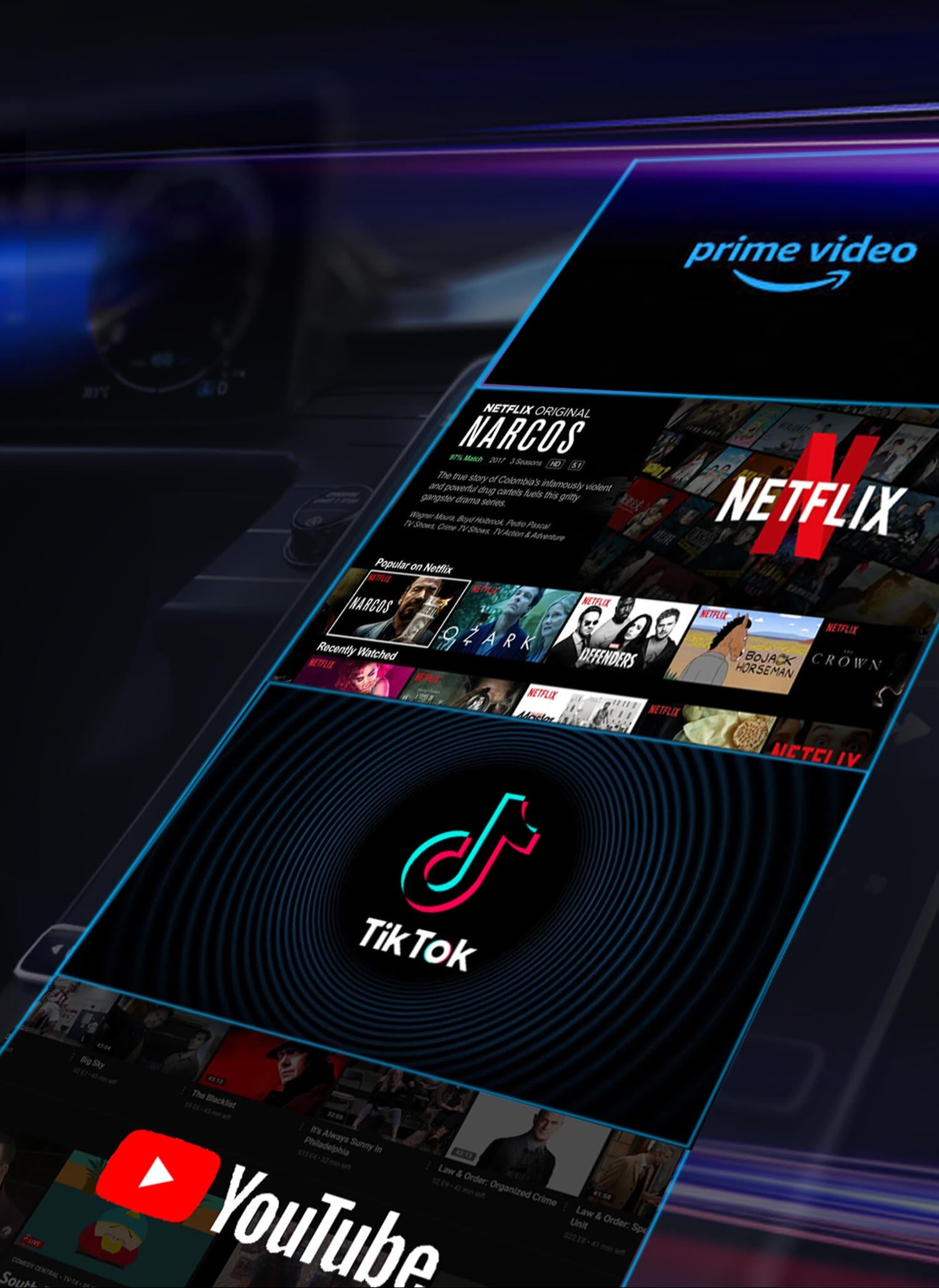 Viva uma aventura de cinema móvel em cada viagem de carro. Transmita seus filmes favoritos, maratone séries ou aproveite música em movimento — tudo na tela grande do seu carro.