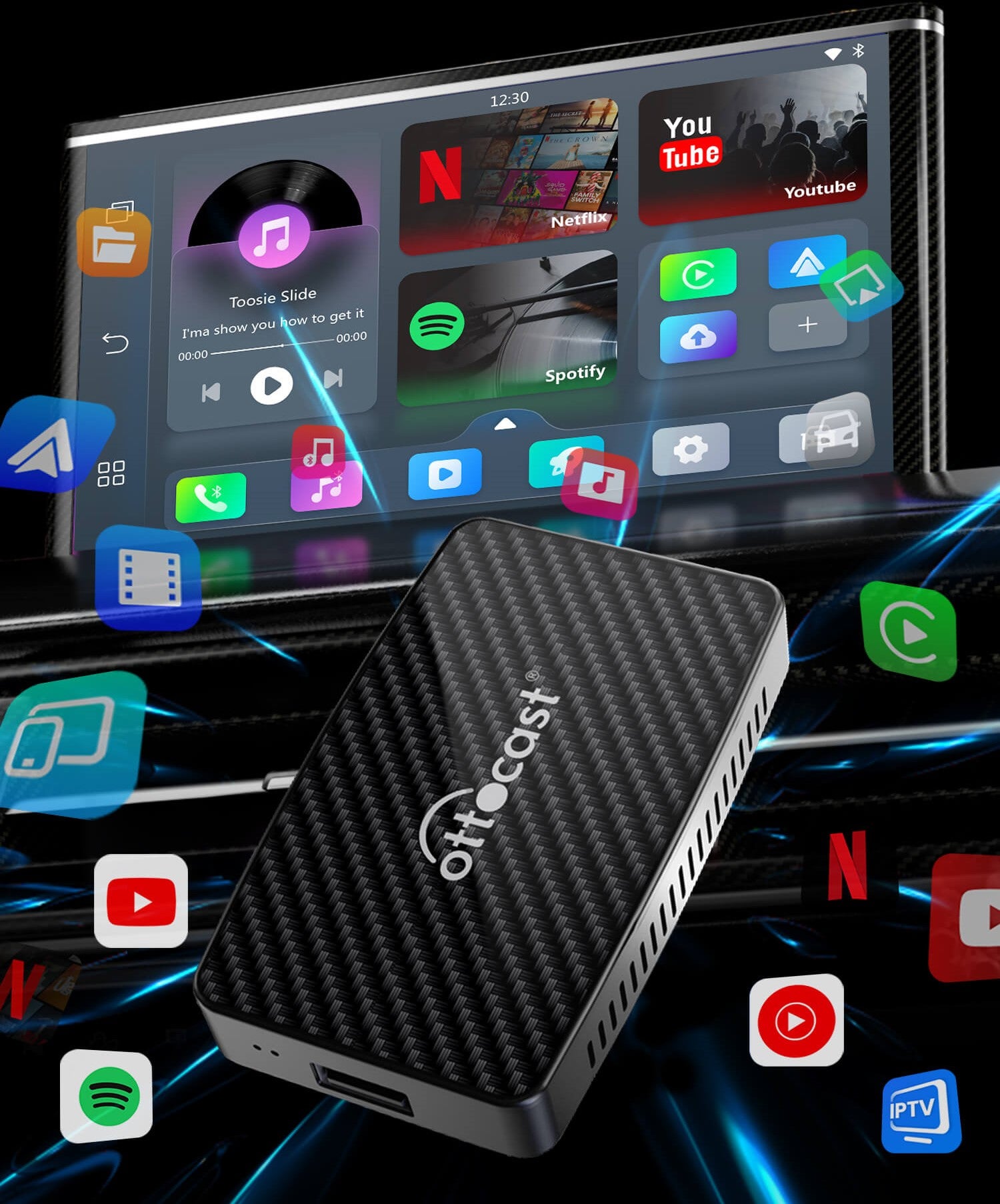 O primeiro adaptador sem fio do mundo para três sistemas. Integre perfeitamente o CarPlay e o Android Auto, e aproveite Netflix, YouTube, IPTV, TikTok e Prime Video.