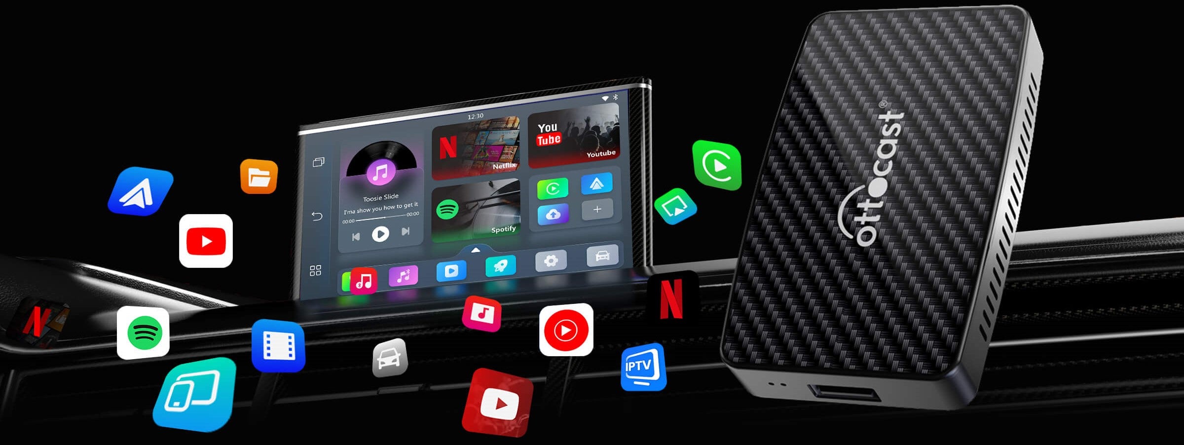 (🎉Promoção de Verão 44% OFF) Ottocast® Play2Video Pro | HUB DE APLICATIVOS + Netflix, YouTube, Prime Video + Adaptador Wireless CarPlay Android Auto